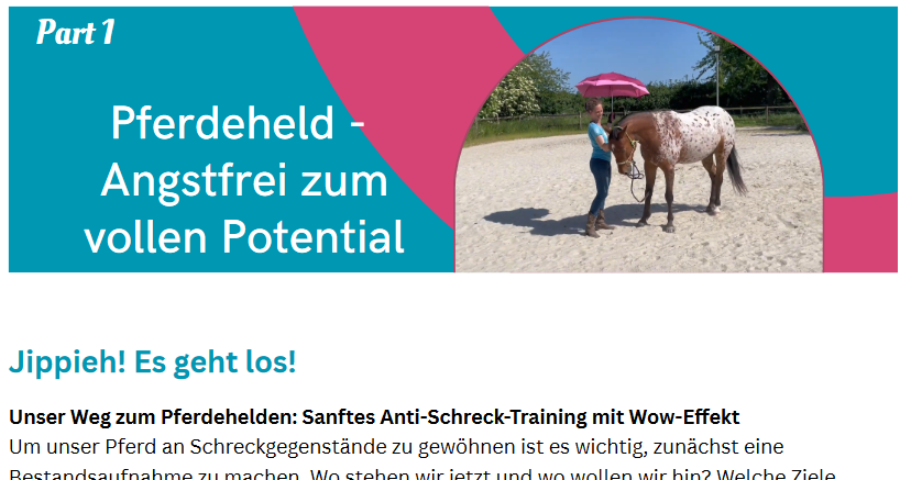 "Ich hatte immer Angst, etwas beim Desensibilisieren falsch zu machen. Mit dem Kurs und der Schritt-für-Schritt-Anleitung habe ich mich endlich getraut! Jetzt vertraut mein Pferd mir auch in Schrecksituationen."